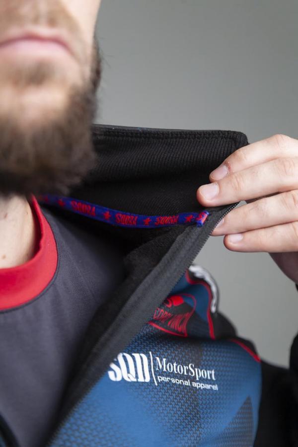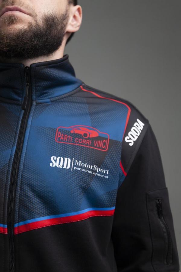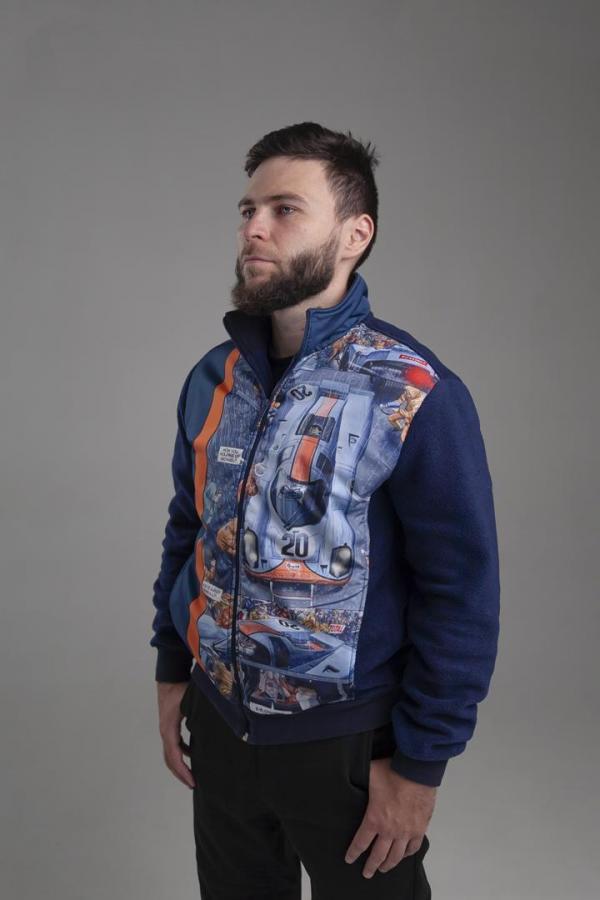 Комбинированное исполнение олимпийки из флиса, фронтальная часть из ветрозащитной ткани в печатном дизайне.