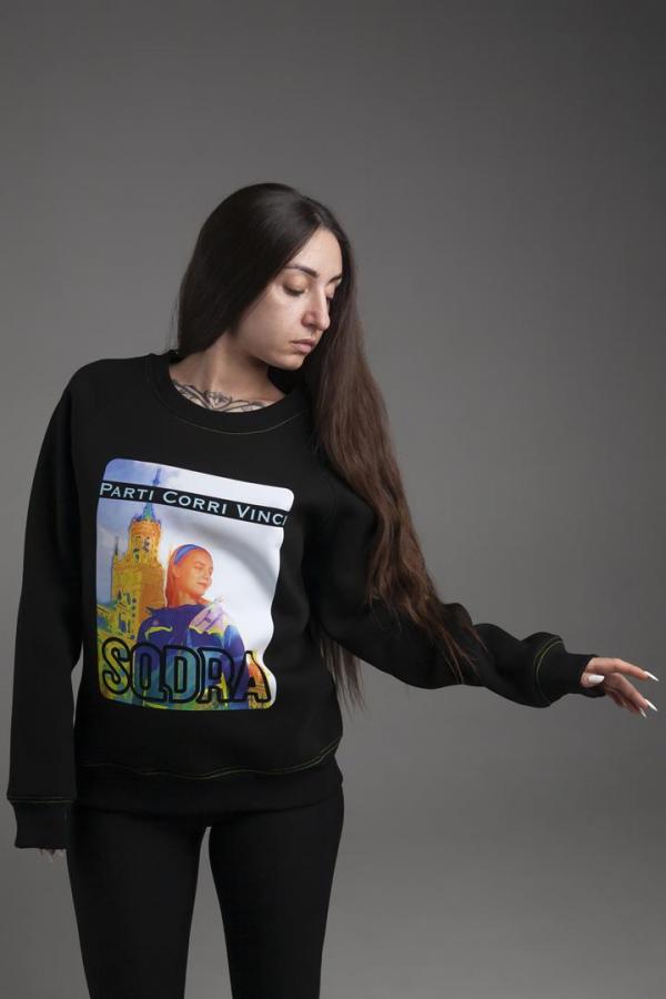 Комбинированное исполнение олимпийки из хлопковой ткани с кокеткой в сублимационном дизайне.