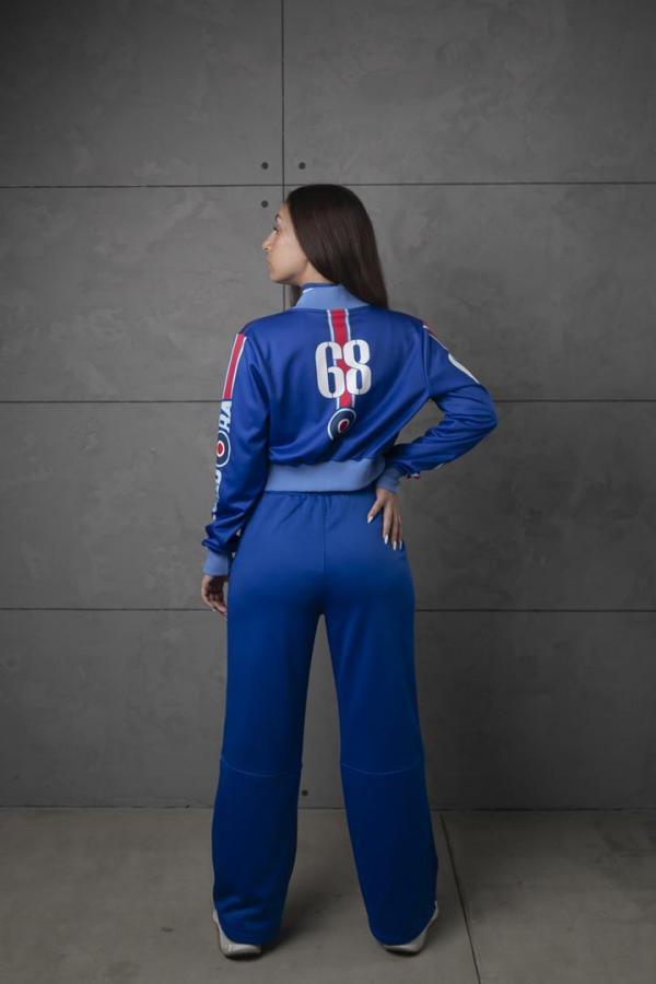 Женский укороченый вариант олимпийки с воротниском в стиле "бомбер" в сочетании с прямыми широкими спортивными брюками.